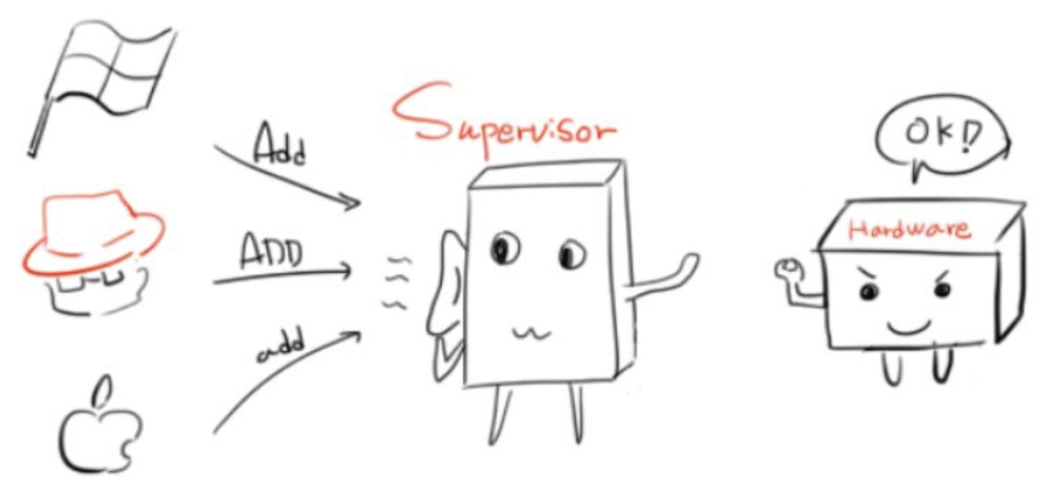 로마에 가면 로마법을 따르는 것 처럼, 각 OS는 고유의 규칙을 가지고 있고 같은 것을 표현하는 방식도 OS마다 틀리다. 각기 다른 표현을 Hypervisor(엄밀히 말하면 DOM0)가 핸들링하여 Hardware가 알아 먹을 수 있는 표현으로 변환 한 다음, Hardware에게 전달한다.