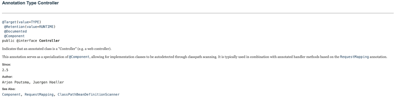 - https://docs.spring.io/spring/docs/current/javadoc-api/org/springframework/stereotype/Controller.html
