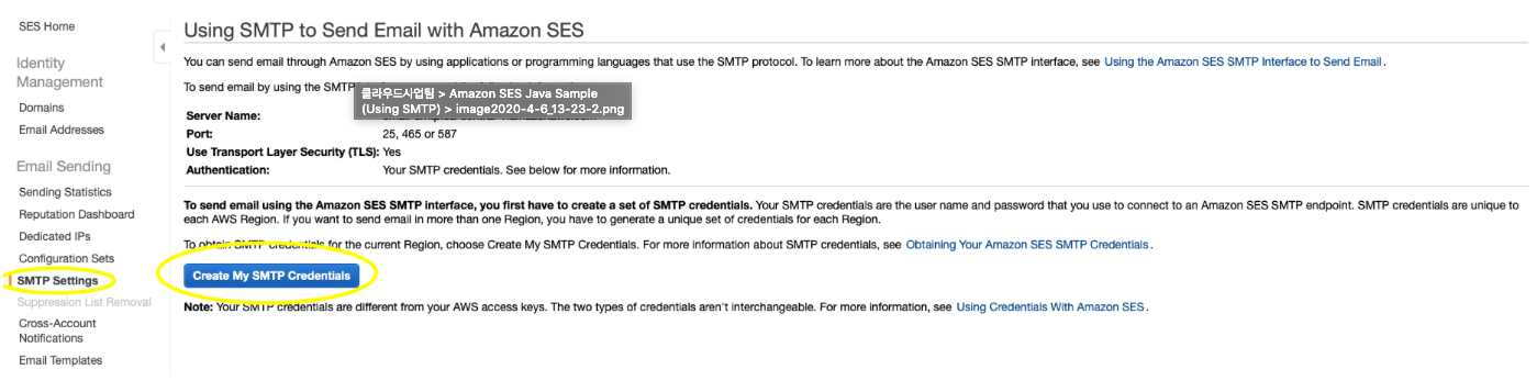 SMTP를 이용하기 위해서는 별도의 IAM Credential이 필요하다. 다음 화면에서 발급 절차를 진행한 후, 발급된 credential를 잘 보관하길 바란다.