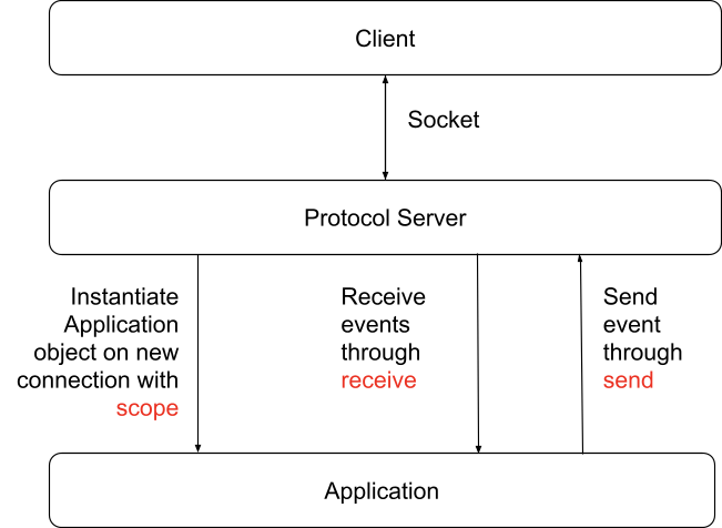 ASGI Application은 단일, 비동기 callable 속성을 지니고 있다. 수신 요청에 대한 정보를 포함하는 scope를 accept하고, 클라이언트에 이벤트를 보내고 받을 수 있는 awaitable를 보내고 받을 수 있다. 이 덕분에, ASGI Application은 WSGI의 한계점을 뛰어넘는 수신 / 발신 event를 허영할 수 있다. 그 뿐만아니라 ASGI Application은 background coroutine을 허용하기 때문에 application은 요청을 처리하면서 background에서 다른 작업도 수행할 수 있게 되었다. (ex. 외부 event를 listening 하고 있는 redis queue 등)