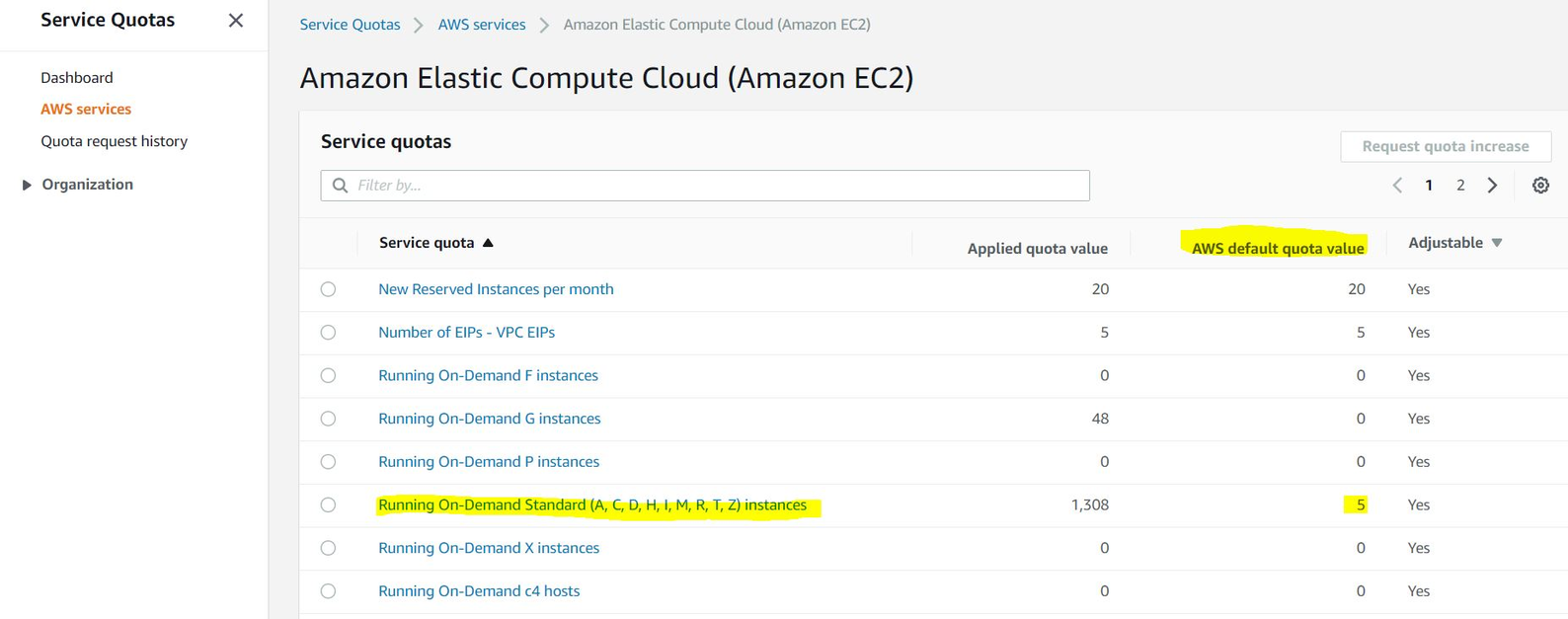 AWS Service Quota Default Limit : 계정의 생성날자, 지불 이력, 자원 사용 이력 등에 따라 프로비저닝 된 한도.