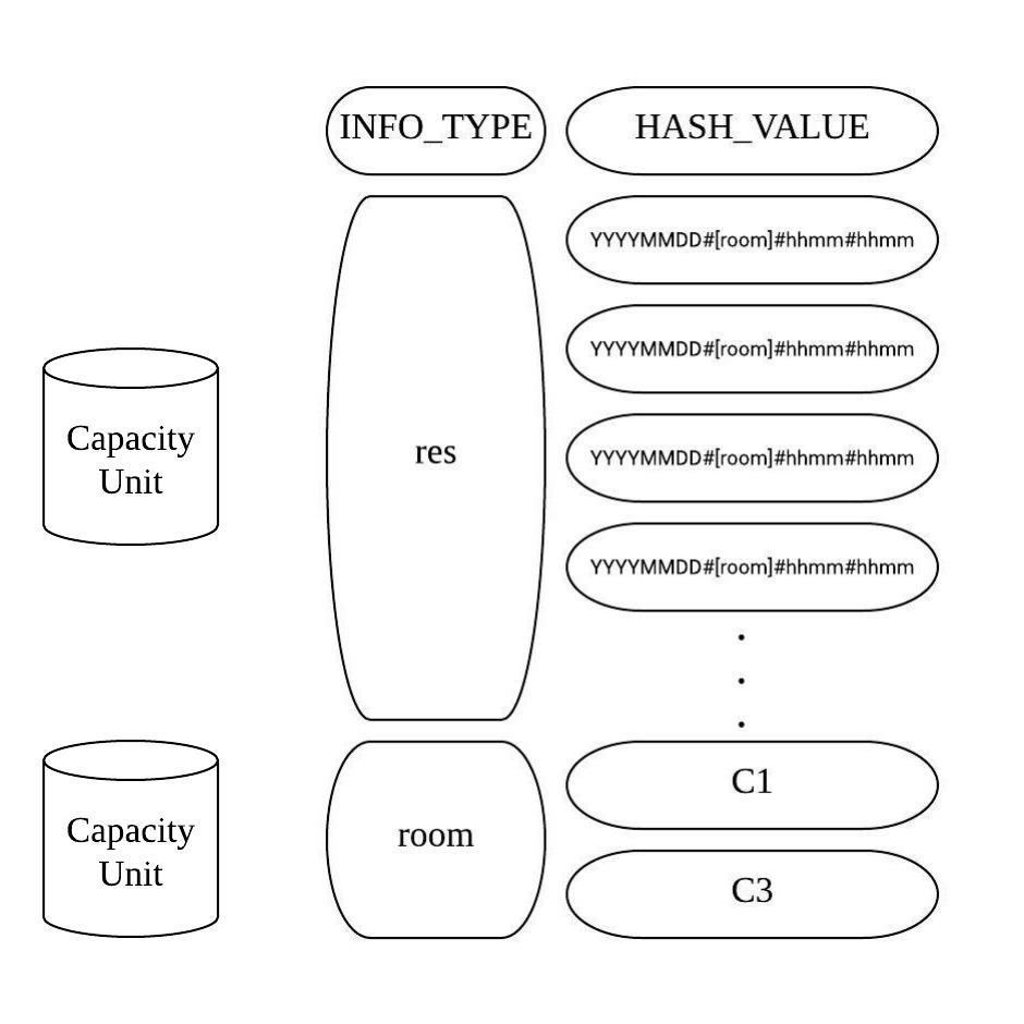 - 회의실에 대한 예약은 현재 HASH_VALUE값 자체를 이용하며, [회의날짜]#[회의실]#[회의시작시간]#[회의종료시간] 의 format을 가진다.