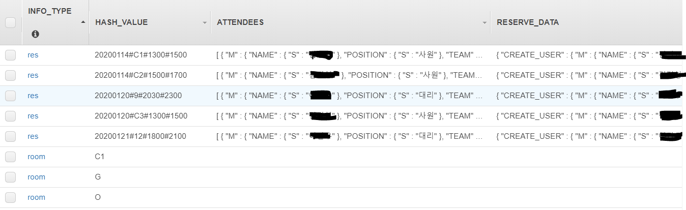 위 테이블의 경우, 사내 회의실 예약 시스템에 대한 정보를 구현하기 위해 설계한 내역이며, partition key가 INFO_TYPE이며, sort key가 HASH_VALUE로 설계되었다.