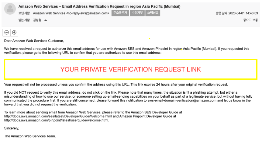 이메일 인증 절차를 진행하게 되면, 등록한 이메일 주소로 다음과 같은 메일이 발송된다. 메일에 첨부된 verification request link에 대해 http request를 보내면 최종적으로