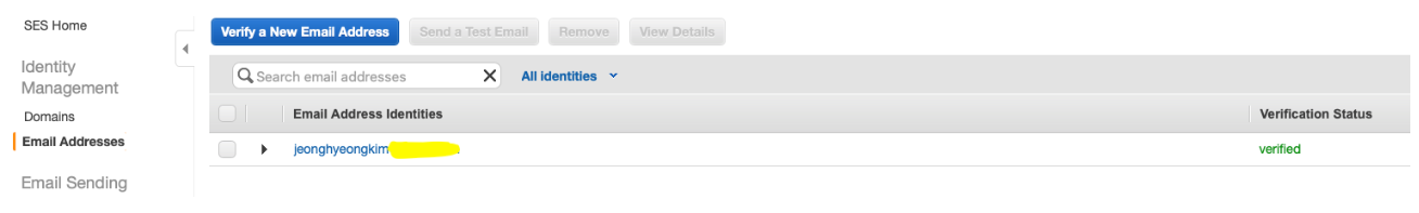 먼저, 다음과 같이 SES console에서 이메일을 등록하고, 이메일 인증을 거쳐야 Amazon SES를 이용가능하다.