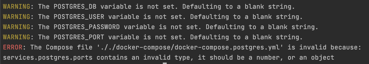혹시나 싶어서 docker-compose.postgres.yml 파일과 .env가 제대로 구성이 안되어있는지 확인을 해본 결과 다음과 같았다.