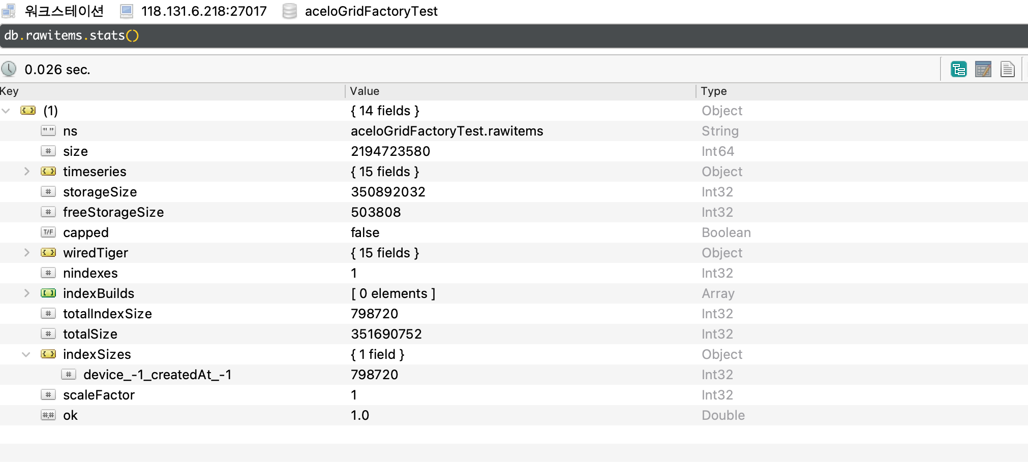 - {createdAt:-1} : 기본으로 timeField를 선언하면 제공된다고 문서상에서 언급하여 만들지 않음, 이 가려진 인덱스에 대해서 크기를 알 수 없다.