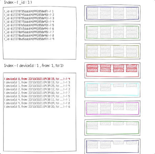 document를 받게되면 해당 document들은 순차적으로 disk의 block에 쌓이게 된다. 우리는 block에 쌓은 데이터에 access 하기 위해 인덱스를 생성하곤 한다. 그러나 이는 장기적으로 보았을 때, document를 read하는 데에서 문제가 발생한다. 특정 시간대의 device data를 보기 위해서는 여러 작은 document들을 fetch 해야하며, 이를 위해 컴퓨터는 넓게 분산된 disk block를 뒤지기 시작한다. 결론적으로, 읽어야 하는 block에 대해 동일한 DB의 cache를 사용하게 되는 비효율성이 생긴다. 이 과정에서 많은 resource가 낭비가 된다.