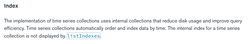 - 샤딩을 할 수 있으나, 샤딩된 timeseries collection의 granularity 및 일부 admin commands를 사용할 수 없다.