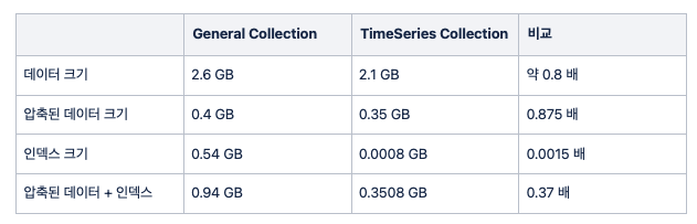 - 시계열 데이터에 대해 일반 collection data 보다 차지하는 데이터의 크기가 작다.